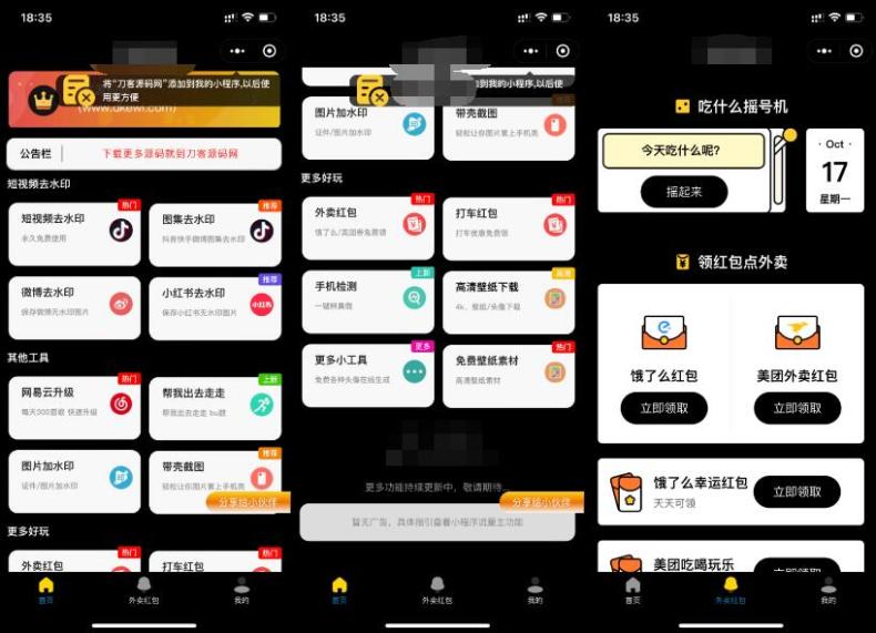 40源码 » 黑色简约多功能工具箱去水印外卖流量主小程序源码