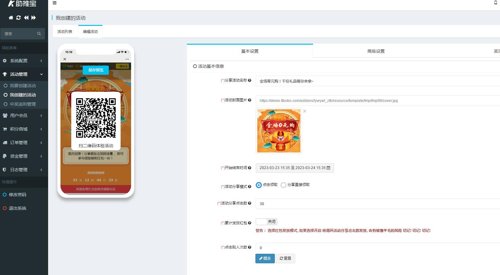 PC端商户中或手机端商户均可创建活动,以下为前端商户中心演示